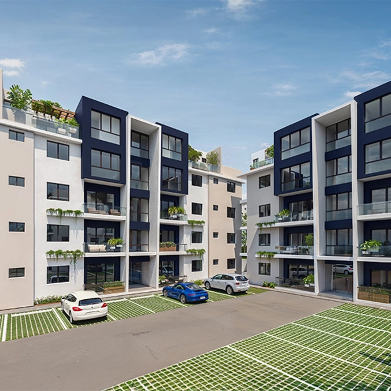 Residencial de 24 apartamentos distribuidos en 3 edificios, cada edificio con 2 apartamentos por nivel 🏗️